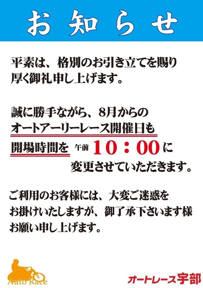 アーリーレース開場時間変更のお知らせ【オートレース宇部】