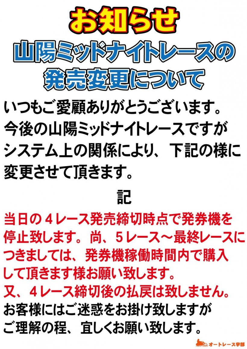オートレース宇部発売スケジュール更新のお知らせ【オートレース宇部】